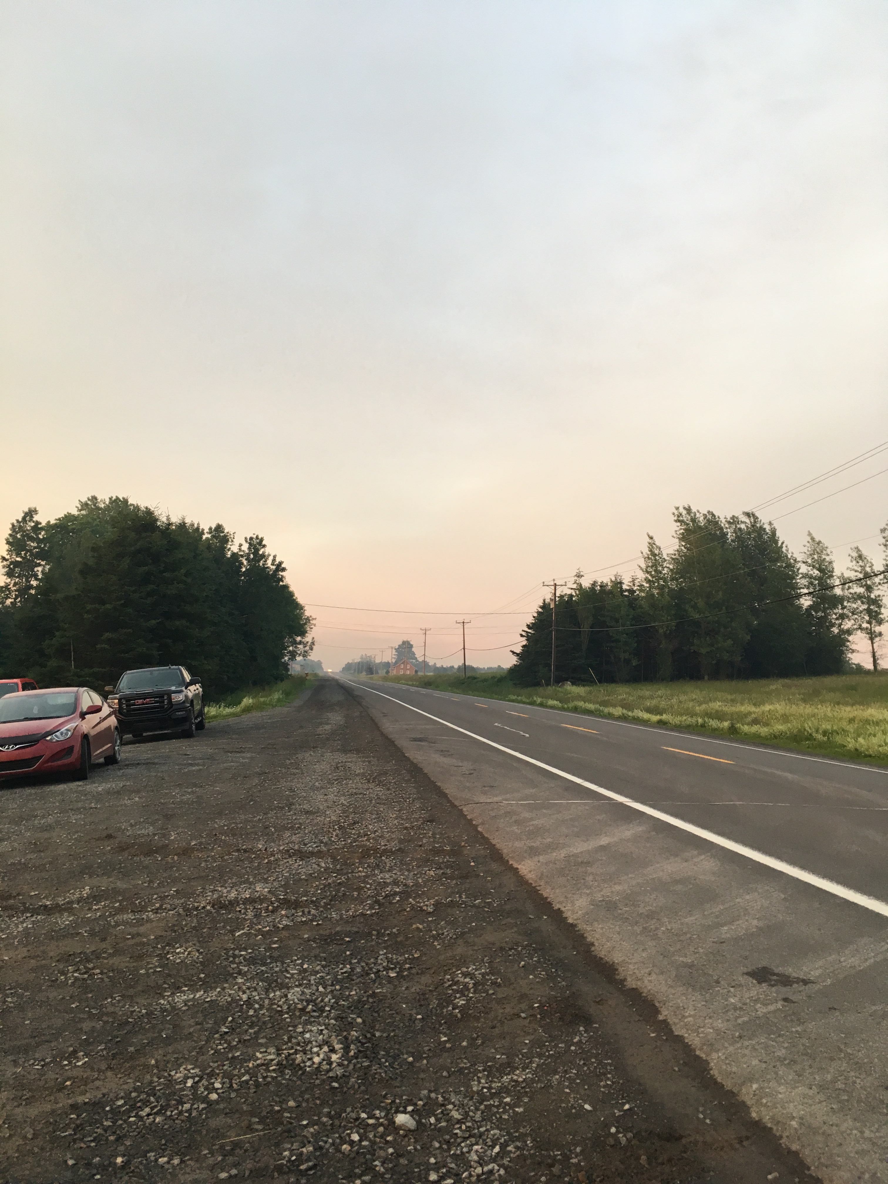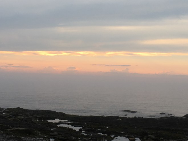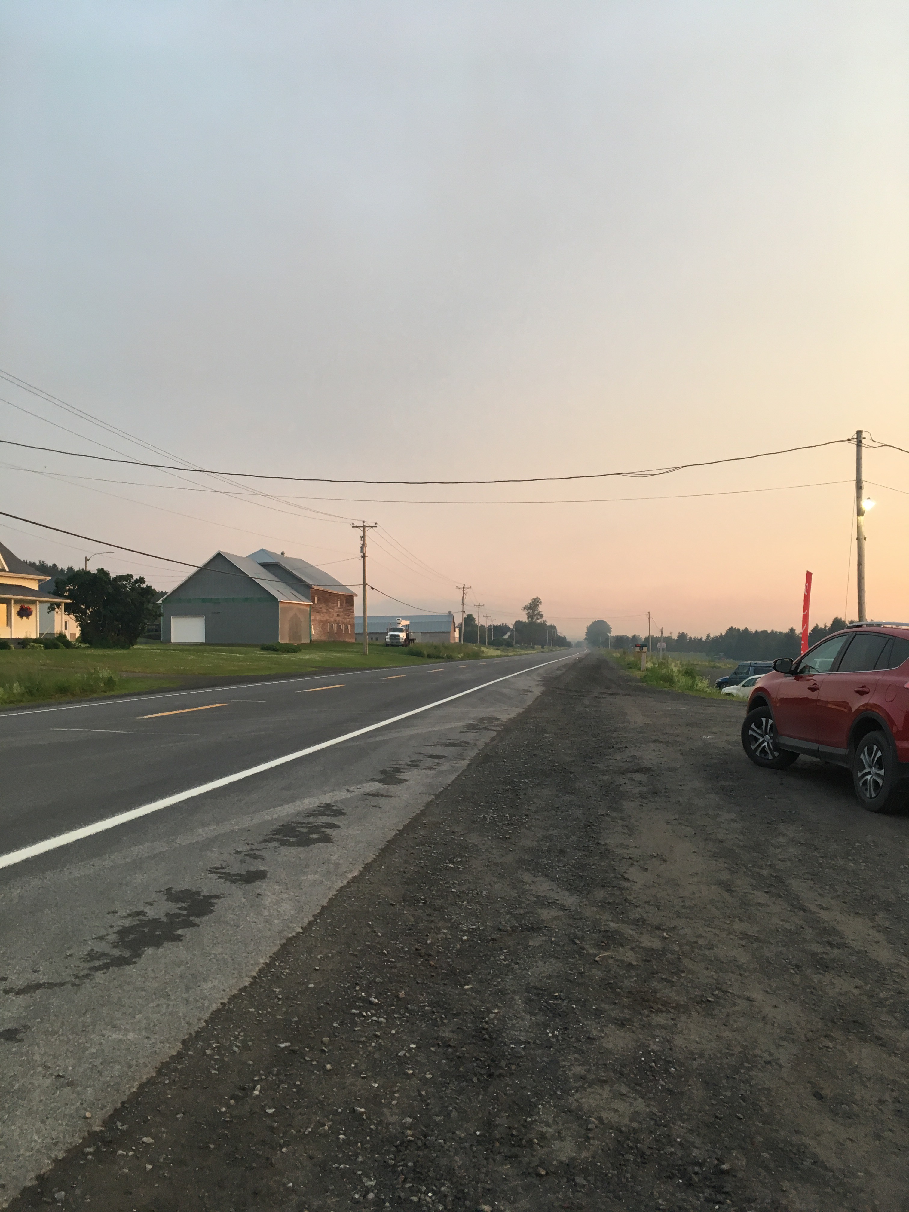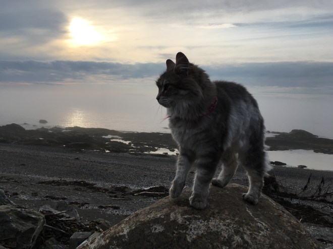 Nous profitons d’abord du spectacle depuis le gîte avec une bonne bière amérindienne de Gaspesie, et en compagnie du chat des voisins.