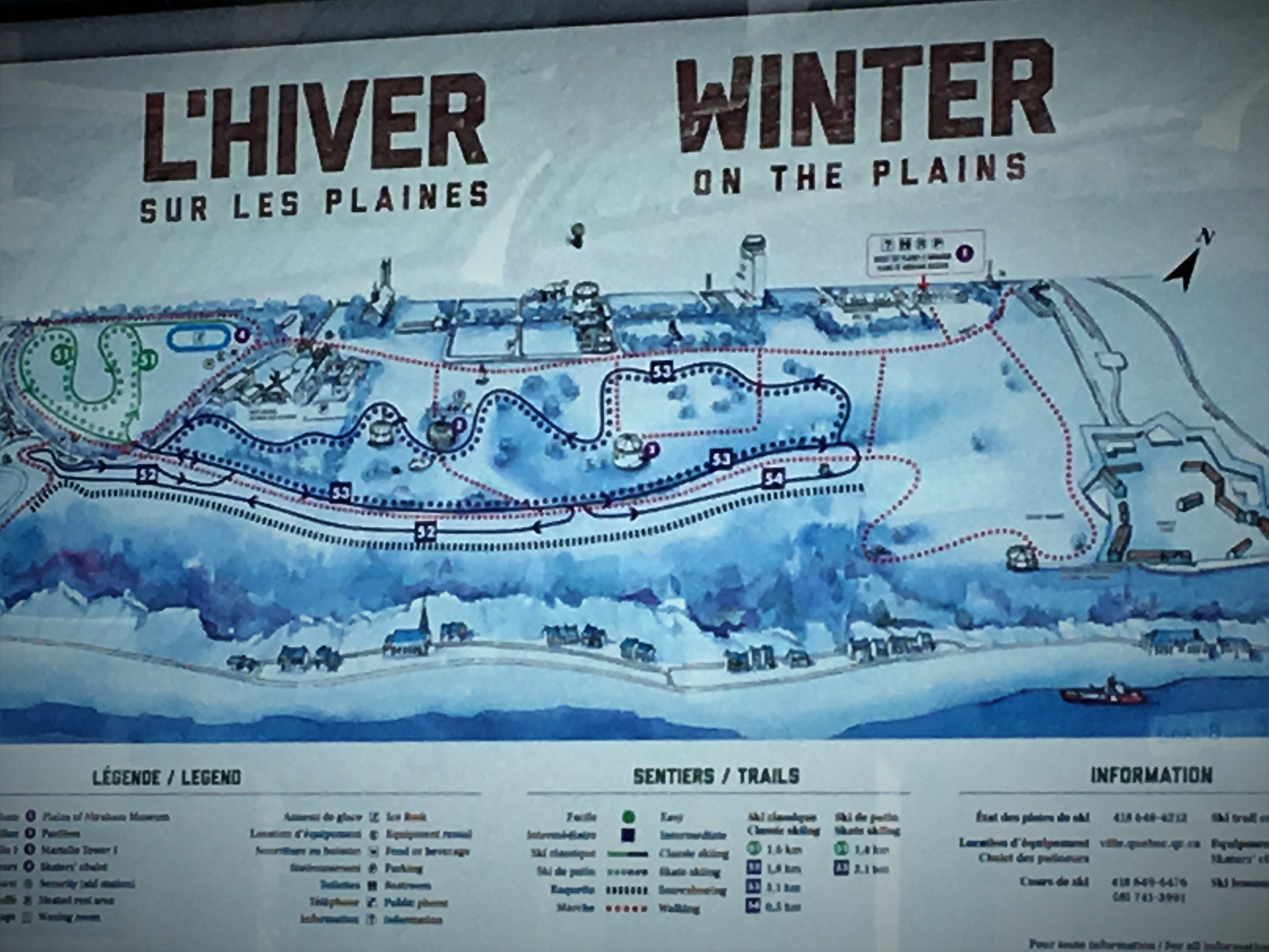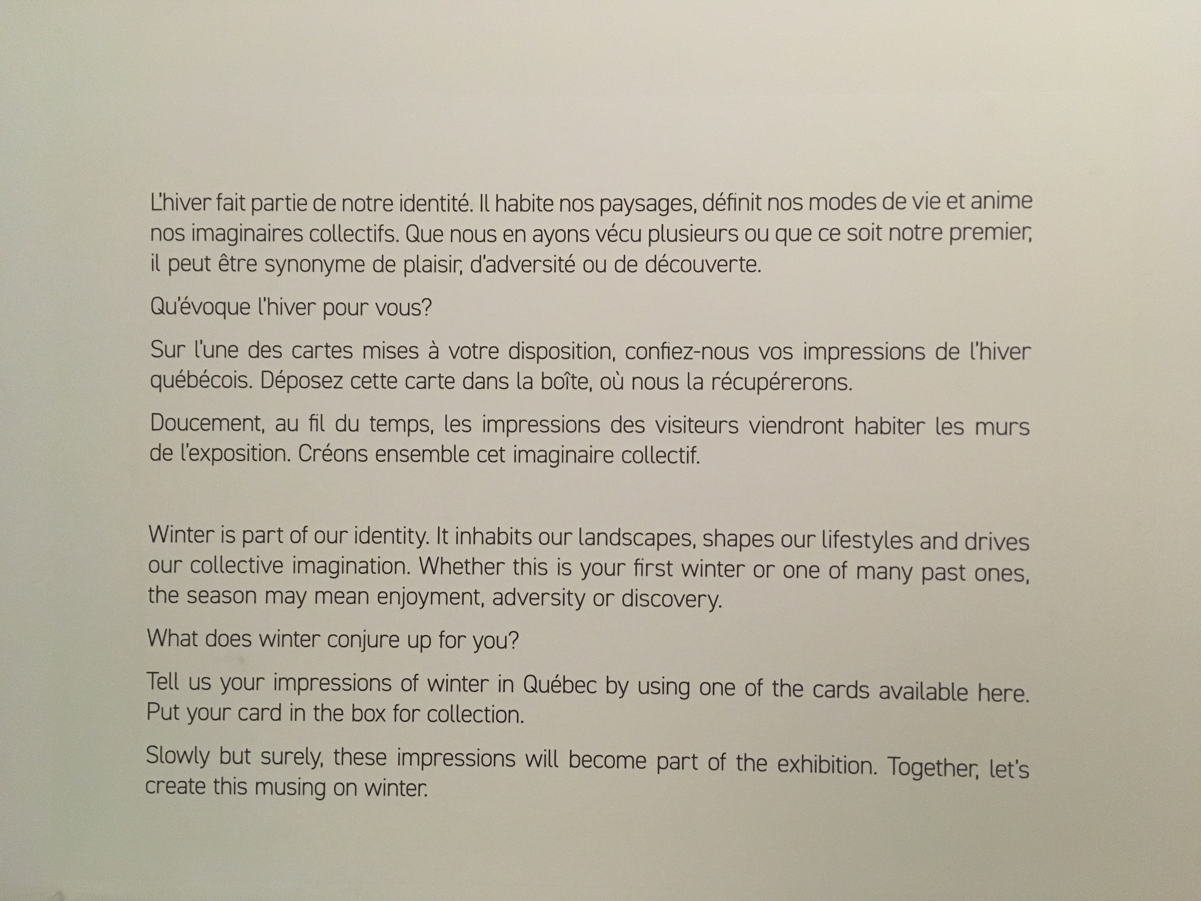 Le temps s’est de nouveau mis au froid et se prête bien à des activités à l’intérieur. Même les abords du musée sont très beaux. Nous découvrons les Plaines d’Abraham couvertes de neige en allant vers l’expo temporaire dédiée à l’hiver. Le décor est comme qui dirait raccord!