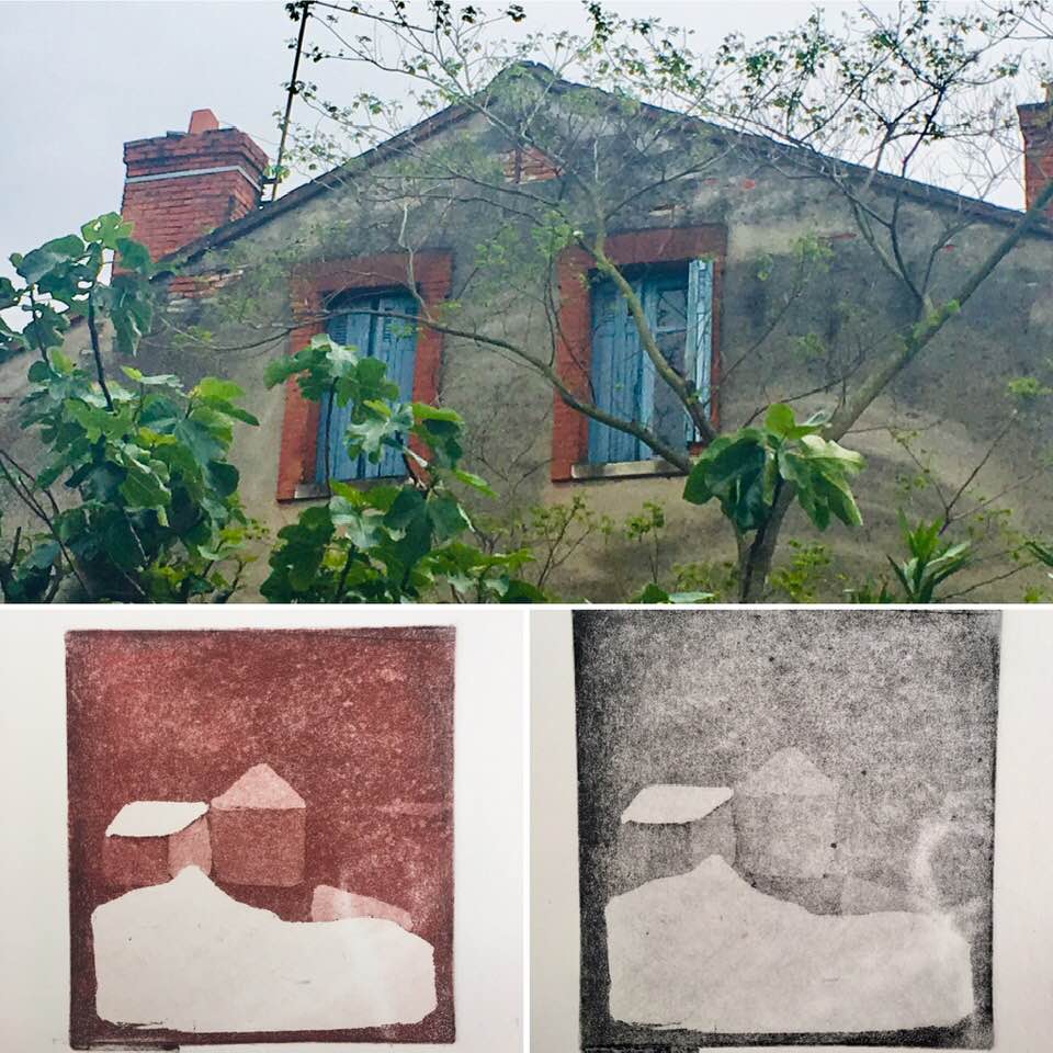 Ici, « les saints de glace » sont passés, le printemps s’installe mais dans l’atelier souffle encore le souvenir vivace des tempêtes de neige, le désir d’enfouissement que tout ce blanc a suscité en moi . Dans cette nouvelle plaque, seule l’aquatinte rythme la plaque et traduit ce monde enseveli où une petite maison demeure….