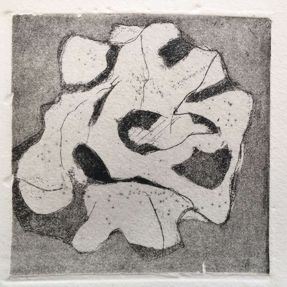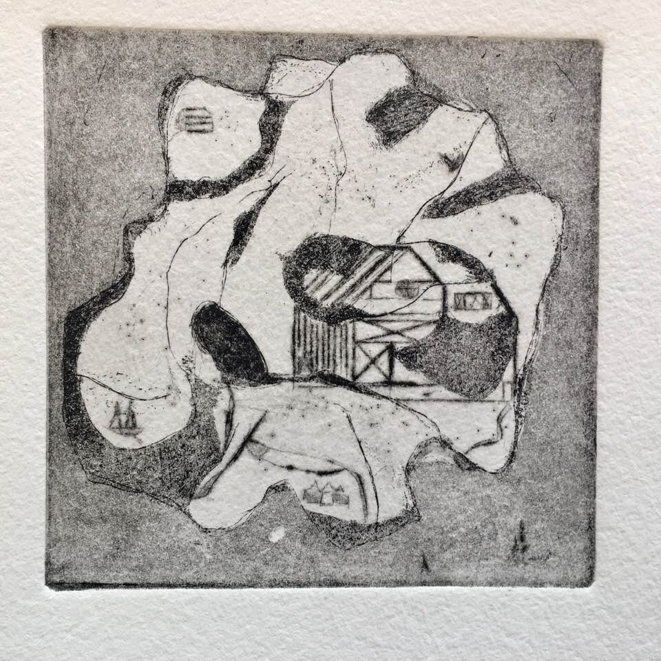 Inspirée par ma lecture du roman « Ours » de Marian Engel dont je vous parlerai dans mon prochain billet sur ma bibliothèque boréale https://lapoudredestampette.wordpress.com/2019/04/28/ma-petite-bibliotheque-boreale-1ere-partie/, cette eau-forte marie deux thèmes qui me sont chers: les îles et les cabanes.