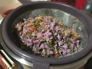 Mais le chant des confinés dans tout ça, me direz-vous? Et bien, la chanson s’est imposée à moi bien avant que je ne tombe sur les recettes. Je la fredonnais en passant le pont où les belles grappes se formaient, s’épanouissaient jour après jour.