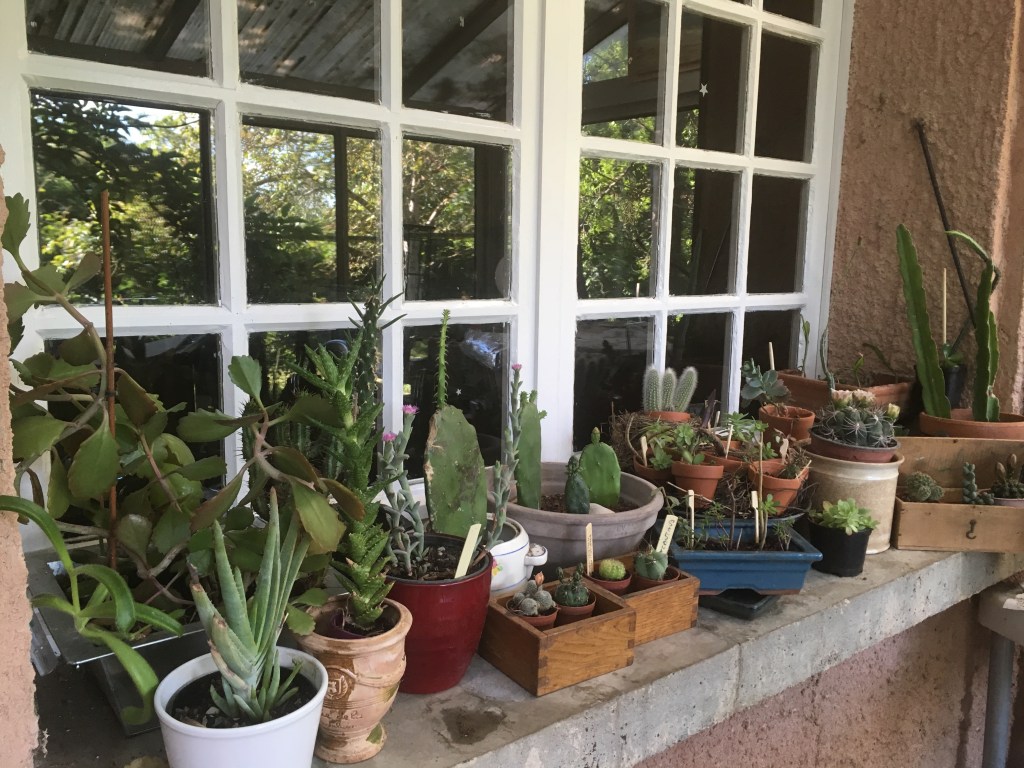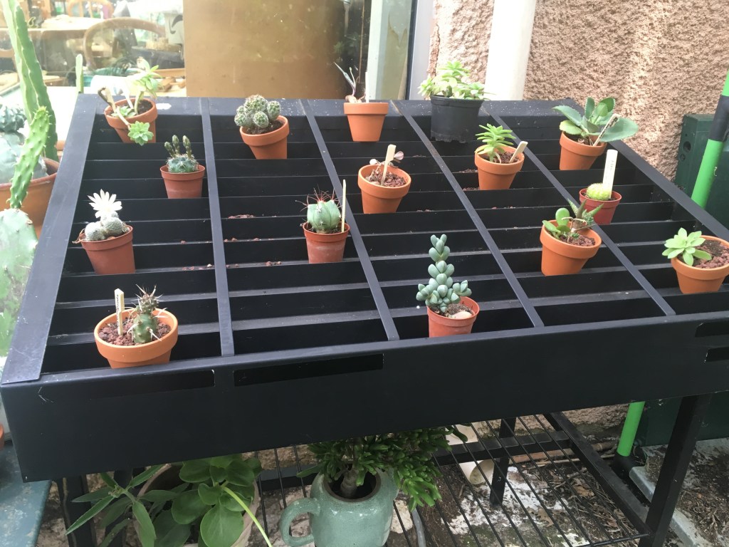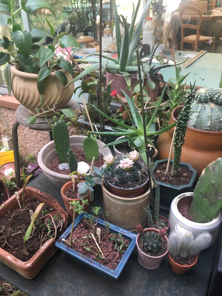 Sur les conseils de mon maître ès cactus qui se reconnaîtra, j’ai installé dehors ce matin tous mes petits cactus et succulentes qui m’avaient patiemment attendus pendant 9 semaines dans la véranda.