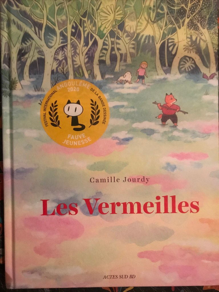 La couverture de l’album Les Vermeilles de Camille Jourdy avait tout pour me plaire et me faire voyager loin, dans le monde de l’enfance: tendre comme un bonbon à la guimauve mais pas mièvre, titre énigmatique, forêt de contes en arrière-plan, maison d’édition fétiche, belle épaisseur en main, comme qui dirait longue en bouche : c’est elle qui me fallait pour affronter un printemps entre les murs.
