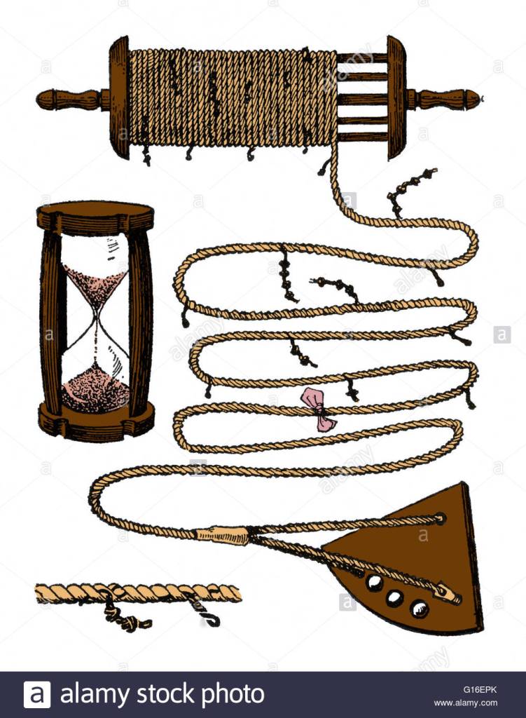 Cette citation nous raconte que le « log » (morceau de bois) était un journal de bord dans un bateau mais c’était d’abord un instrument de mesure . Les marins utilisaient en effet une pièce de bois lestée et une bobine de corde sur laquelle étaient noués des chiffons de différentes couleurs . La vitesse à laquelle la corde à « noeuds » se déroulait donnait une indication de la vitesse du bateau et a donné naissance à l’unité de mesure en noeuds nautiques.
