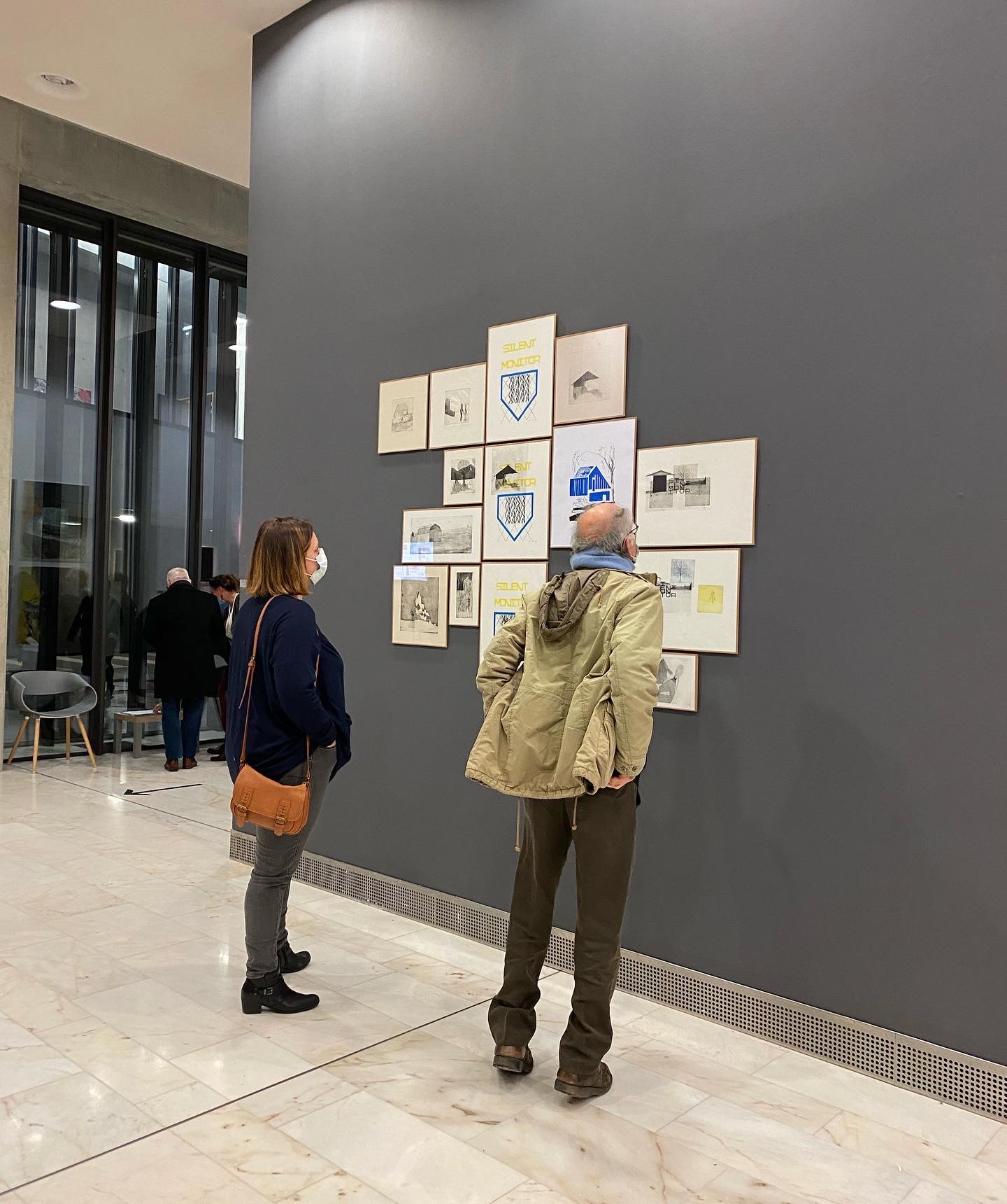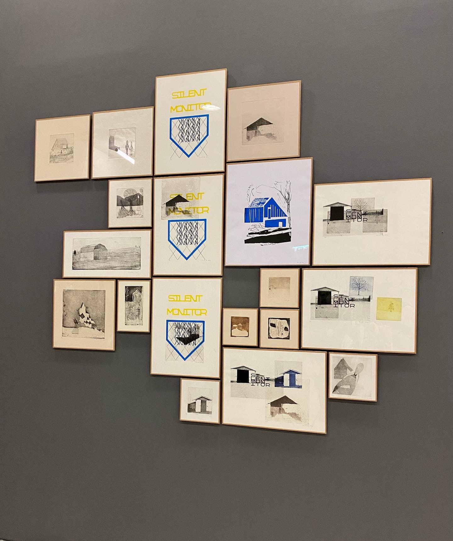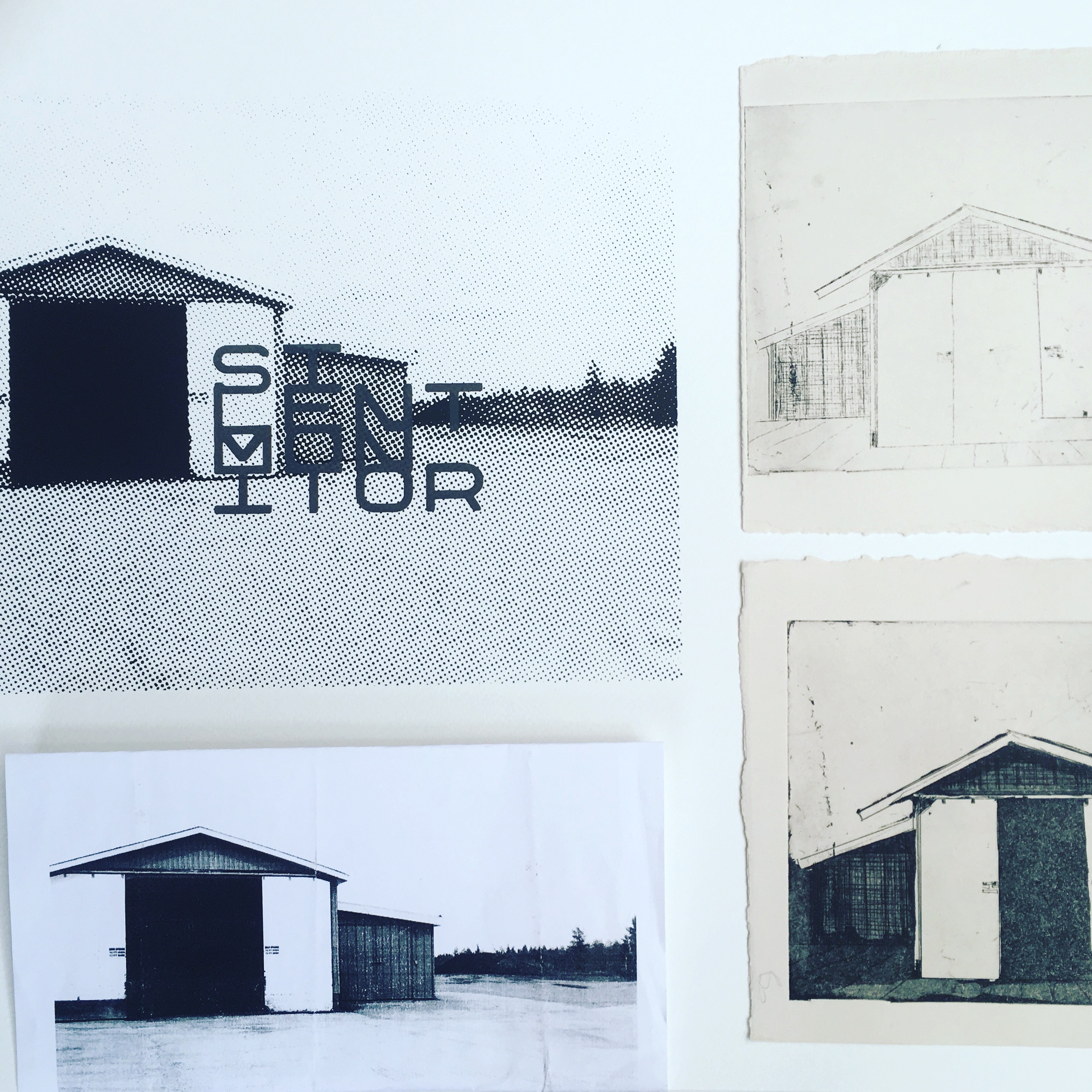 Silent Monitor I, sérigraphie en 3 couleurs primairesSilent Monitor II: en haut à gauche sérigraphie en 2 couleurs inspirées par la photo de Denis Rioux en dessous. Autour, des essais de combinaison avec des tirages gravure juste posés