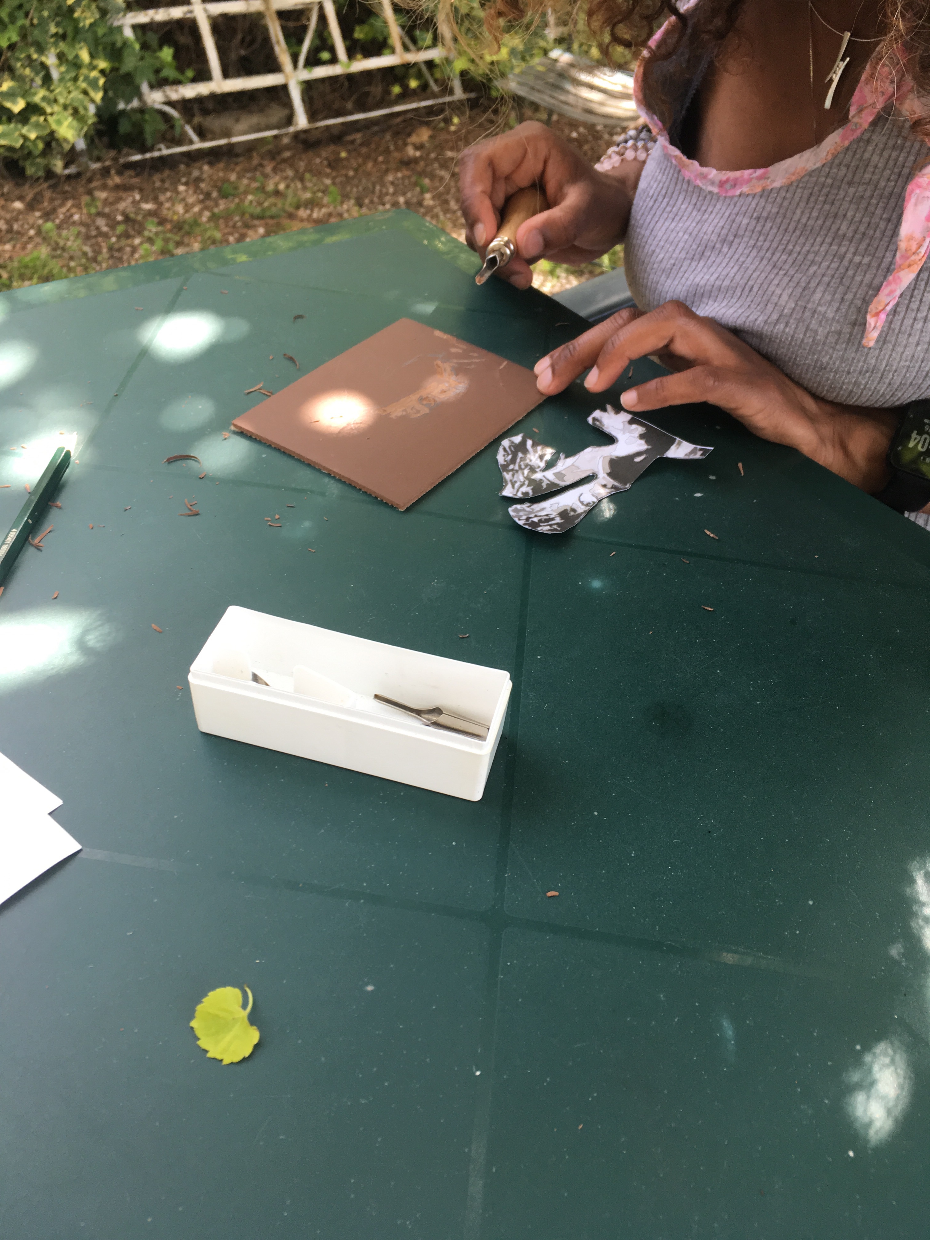 2.Les eaux-fortes sur cuivre. On appelle eau-forte une gravure réalisée sur du métal ( pour moi, du cuivre) qui a été mordu dans un acide (aquaforte, d’où le nom d’eau-forte). La plaque de cuivre est tout d’abord longuement poncée et polie puis on applique un vernis à graver qui doit sécher au moins 48h. Ensuite, on grave dans ce vernis à l’aide d’une pointe sèche. L’acide va attaquer ces traits et créer des creux qui seront ensuite encrés. La plaque est encrée à la main et essuyée avec beaucoup de délicatesse pour ne laisser l’encre que dans les tailles. C’est ainsi que la gravure apparaît à l’impression.