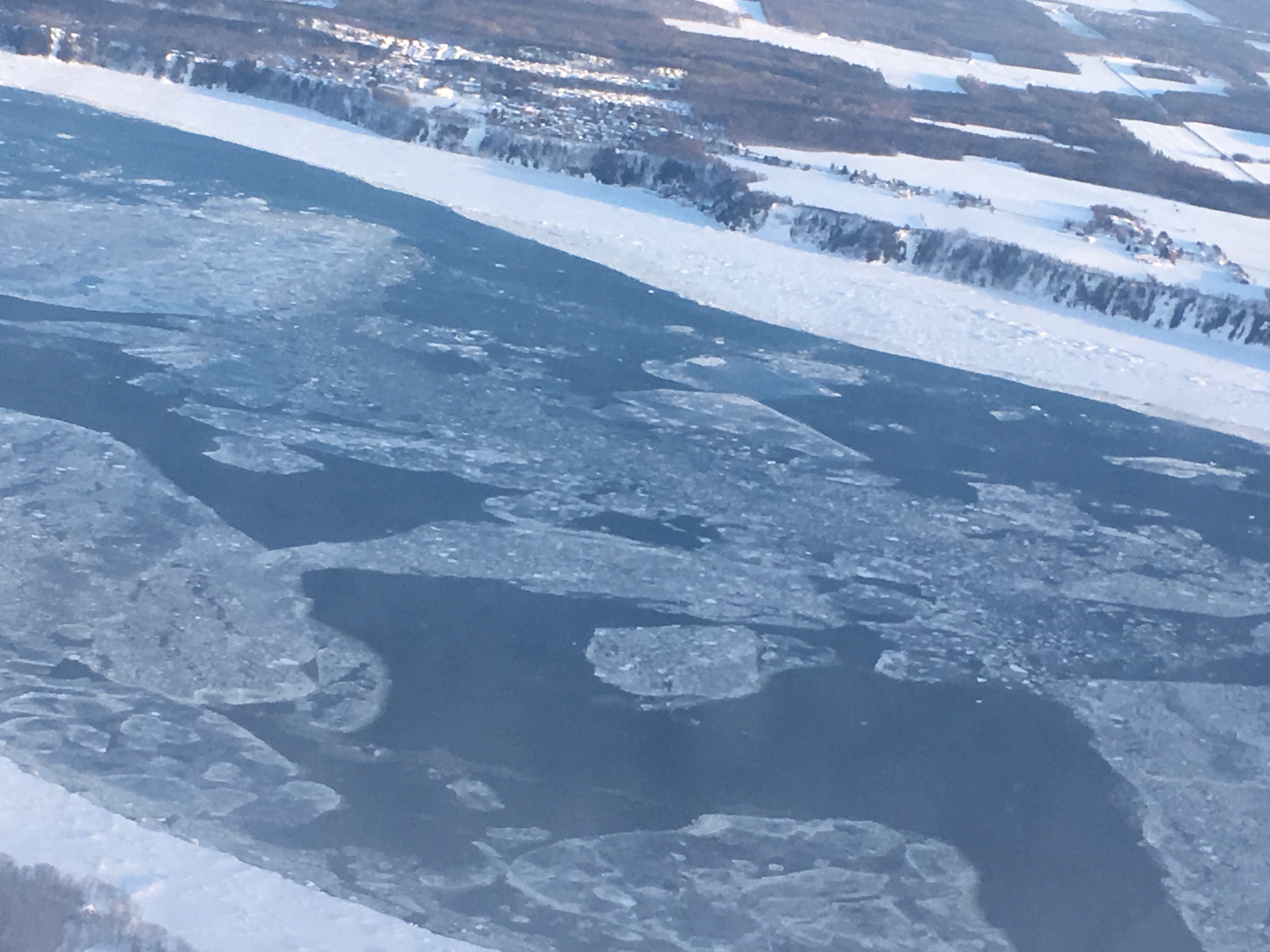 Il faut y aller à petits pas car tout le long du chemin, ça glisse un peu, mes sandales crissent sur le sol gelé saupoudré de sel. En bas, le spectacle est irréel: la rivière est tantôt liquide, tantôt solide, l’eau circule autour de gros blocs de glace. Une trappe et des marches sont emménagées dans le caillebotis pour pouvoir goûter l’eau du bout des orteils ( comme moi) ou pour s’ immerger en entier ( sans moi).