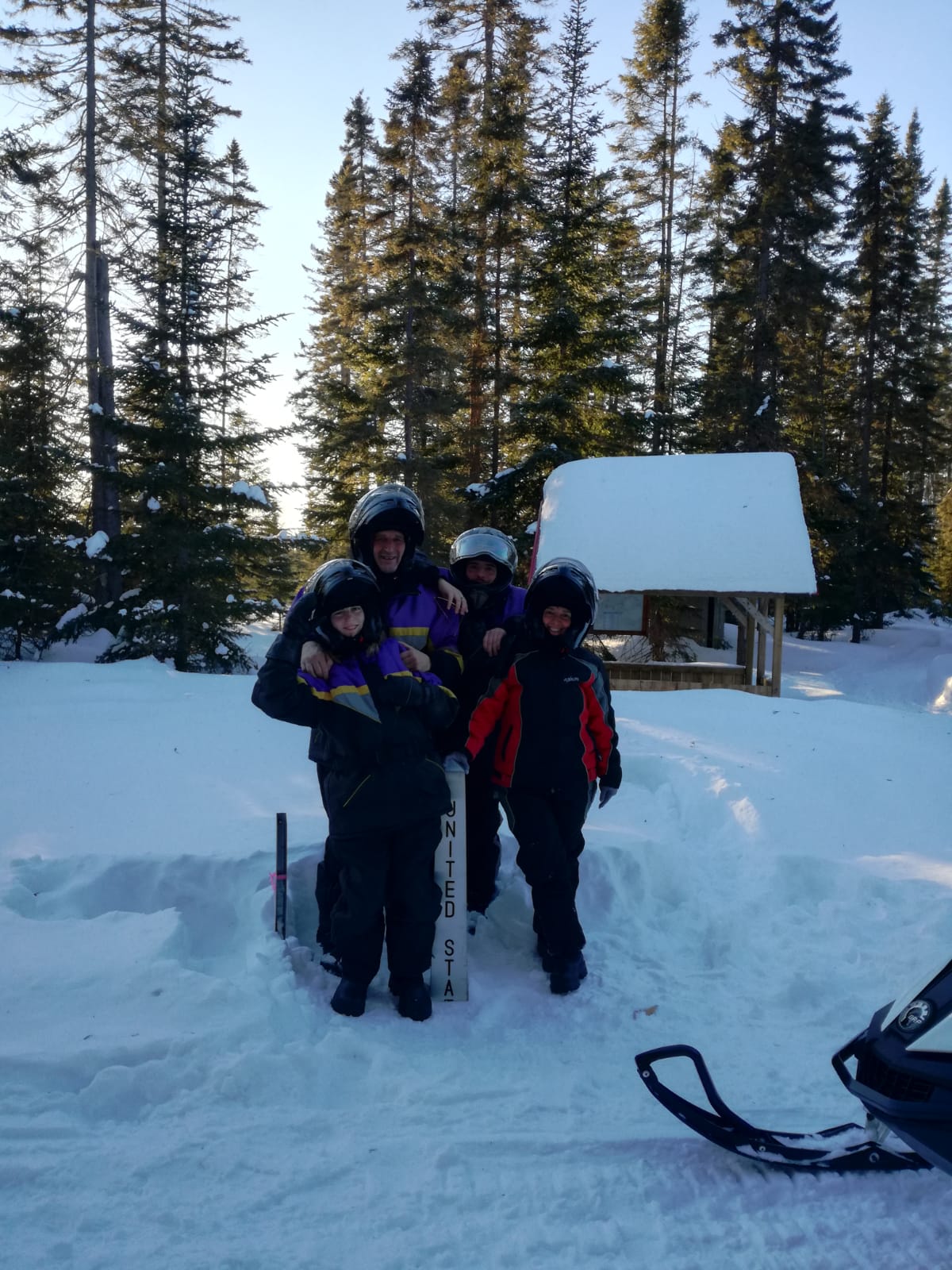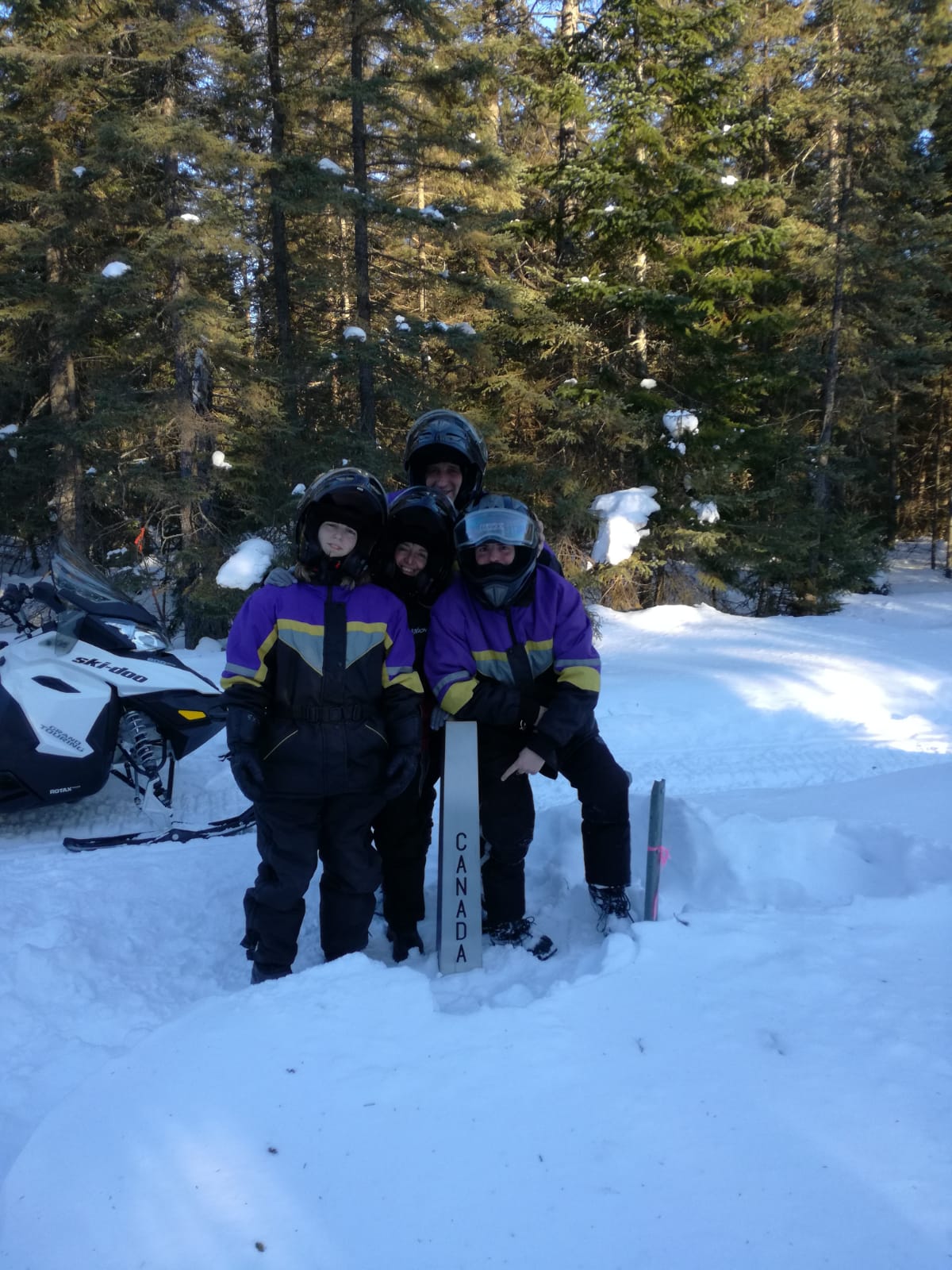 Franchir la frontière entre le Canada et les USA en moto neige…ce fut la surprise de cette sortie. J’avais bien vu que la Pourvoirie longeait la frontière mais je ne pensais pas que nous pourrions la traverser!